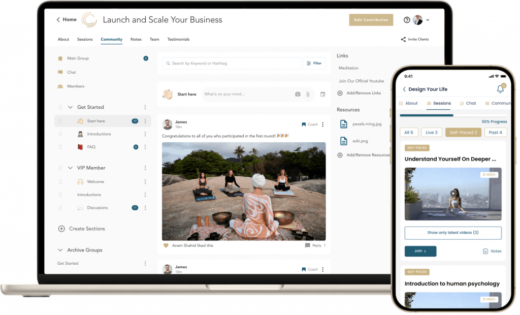 Launch and scale online group programs with live video, self-paced content and a thriving community in 5 simple steps.